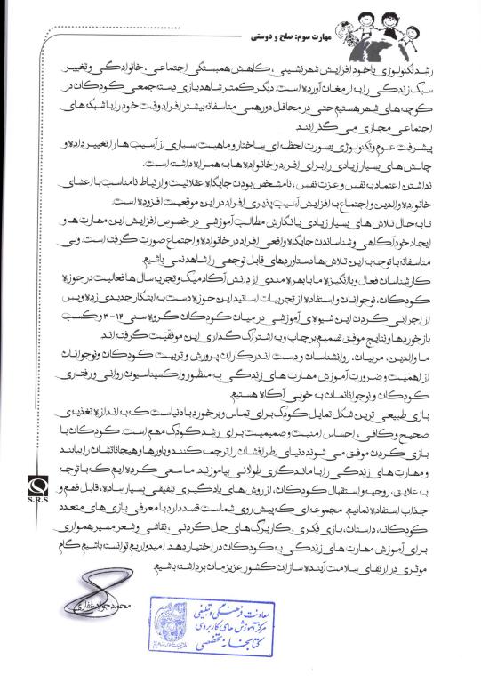 افزایش شهرنشینی و شرایط حاکم بر آن، انجام بازیهای دستهجمعی و در نتیجه کسب مهارتهای اجتماعی کودکان را کمتر کردهاست. مجموعۀ «مهارتهای زندگی» شامل 10 جلد کتاب است که هر جلد به یکی از مهارتهای زندگی میپردازد. جلد سوم این مجموعه به مهارت «صلح و دوستی» اختصاص دارد. در این کتاب20 بازی، 10 کاربرگ (نقاشی، کاردستی، خلاقیت، حلکردنی و مهارتهای نوشتاری، پنج داستان وپنج شعر ذکر شدهاند که همگی میکوشند مهارت صلح و دوستی را که عاملی برای سلامت و بهداشت روانی است، به مخاطب بیاموزند.