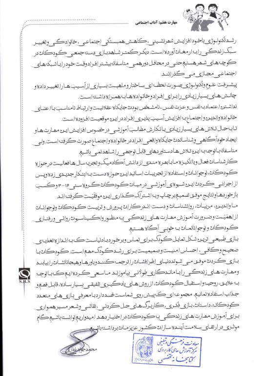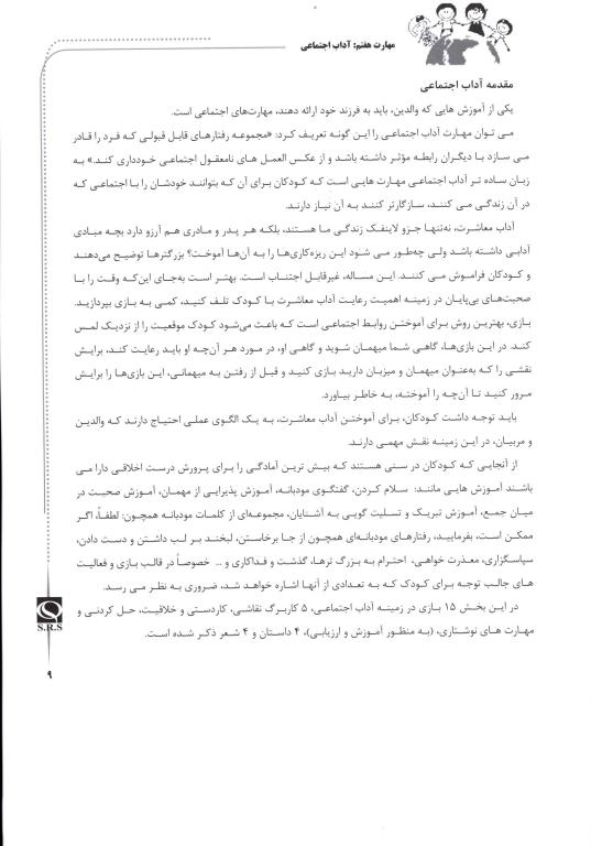 افزایش شهرنشینی و شرایط حاکم بر آن، بازیهای دستهجمعی و در نتیجه کسب مهارتهای اجتماعی توسط کودکان را نیز کمتر کردهاست. مجموعۀ «مهارتهای زندگی» شامل 10 جلد کتاب است که هر جلد به یکی از مهارتهای زندگی میپردازد. جلد هفتم این مجموعه به مهارت«آداب اجتماعی» اختصاص دارد. در این کتاب 15 بازی، پنج کاربرگ (نقاشی، کاردستی، خلاقیت، حلکردنی و مهارتهای نوشتاری، چهار داستان و چهار شعر ذکر شدهاند که همگی میکوشند آداب معاشرت و روابط اجتماعی را به مخاطب بیاموزند.ء