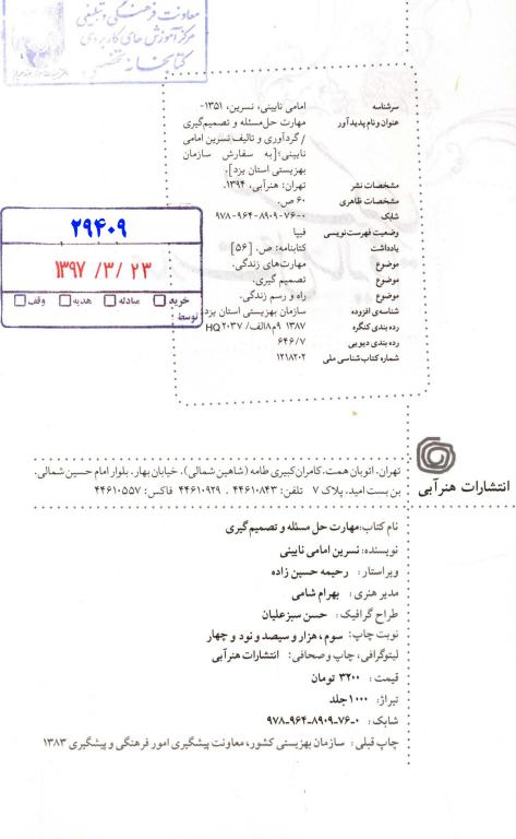 انسان ها برای مقابله ی سازگارانه با موقعیت های تنش زا و کشمکش های زندگی، به آموختن برخی مهارت ها نیاز دارند. یکی از موثرترین برنامه هایی که به افراد کمک می کند تا زندگی بهتر و سالم تری داشته باشند، برنامه ی آموزش مهارت های زندگی است.کتاب " مهارت حل مساله و تصمیم‌گیری " جهت آشنایی هرچه بیشتر آموزشگران با برنامه ی مهارت های زندگی تهیه شده است.