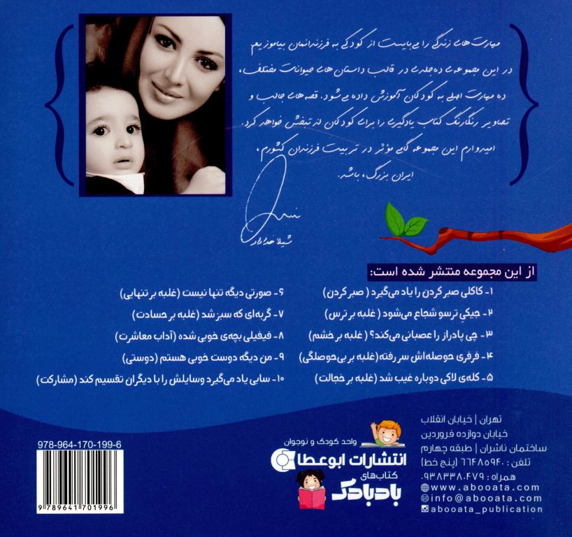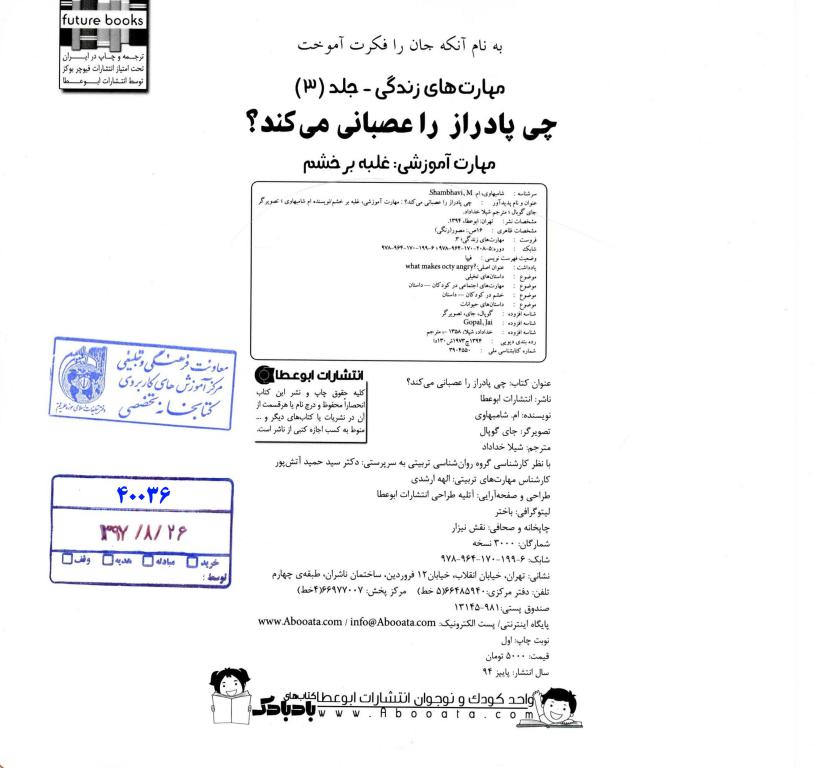 کتاب خردسال چی پادراز را عصبانی میکند؟ از مجموعه کتاب من و مهارت های زندگی این مجموعه که شامل قصه های کوتاه برای کودکان است که توسط سرکار خانم شیلا خداداد ترجمه شده با نظر گروه کارشناسان و اساتید روان شناسی تدوین گشته است و تلاش میکند فضایل و توانمندیهای منشی کودکان را افزایش دهد و آنها را برای حضور در جامعه آماده سازد. ترجمه و چاپ در ایران تحت امتیاز انتشارات فیوچر بوکز توسط انتشارات ابوعطا مجموعه کتابهای من و مهارت های زندگی ویژه ۳ تا ۵ سال 10 جلد درباره ی کتاب از مجموعه کتابهای من و مهارت های زندگی ۱۰ جلدی) مهارت آموزشی غلبه بر خشم در این کتاب مهارت غلبه بر خشم به زبانی ساده و در قالب داستانی کوتاه با تصاویر جذاب به خردسالان آموزش داده میشود همچنین در فواصل داستان سؤالاتی از خردسالان پرسیده میشود تا دقت و توجه آنها را به محتوای کتاب افزایش دهد و در انتهای کتاب نیز صفحه ای مخصوص والدین طراحی شده که در آن اطلاعات بیشتری در خصوص مهارت مورد نظر و راهکارهای تقویت آن در خردسالان ذکر شده است. این کتاب همراه با یک صفحه برچسب است که خردسالان میتوانند با کمک و راهنمایی بزرگترها برچسبها را در قسمت های مورد نظر در داخل کتاب بچسبانند.