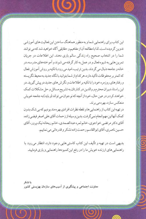 کودکان و نوجوانان حق دارند از آموزش عمومی برخوردار شوند تا آنچه را که برای داشتن یک زندگی سالم و موفق نیاز دارند بیاموزند. چنین آموزشی باید شامل موضوعاتی باشد که مورد علاقه و نیاز واقعی آنها است. آنها میتوانند در چگونگی پیشرفت آموزشهای خود مؤثر باشند. کتاب حاضر به منظور راهنمایی کودکان و نوجوانان و برای هماهنگ ساختن فعالیتهای آموزشی تدوین شده است. هر نوجوان با مطالعه این کتاب از مفاهیم و حقایقی آگاه خواهد شد که میتوانند وی را در انتخاب صحیح راه زندگی سالم یاری دهند. این اطلاعات در جریان تمرینهایی به شیوه فعال و در عمل به کار گرفته میشوند و آموختههای مدرسه، در خانه و جامعه دنبال میشوند.