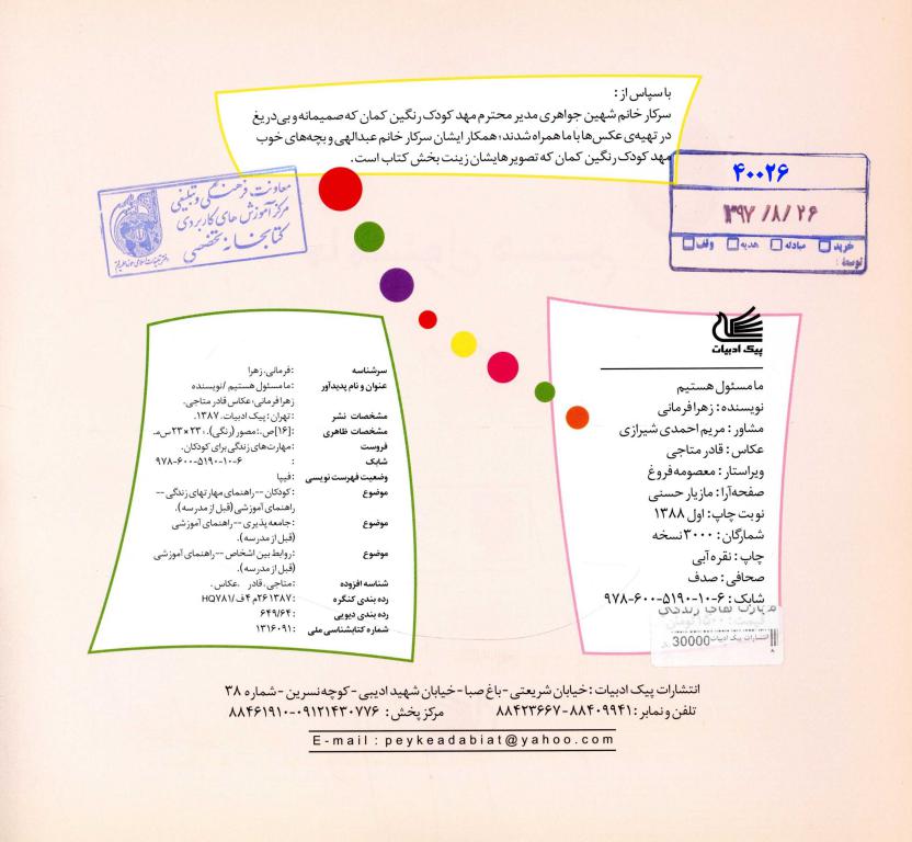 کتاب ما مسئول هستیم،شیوهای خلاق در آموزش مهارتهای زندگی، برای ۴ تا ۸ سالهها نوشتۀ زهرا فرمانی می باشد.این کتاب دیالوگ بین چندین بچه است که با هم همبازی و همسایه هستند. موضوعاتی که بین خودشان و در عالم کودکی پیش میاید را با هم حل میکنند و یا با هم بحث میکنند. این کتاب بهصورت مجموعه نوشته شده و در هر کتاب یکی از مشکلات دوران کودکی را حل میکنند. کتاب ما مسئول هستیم یک کتاب تصویری مانند کتابهای کمیک است که در شانزده صفحه نوشته شده است. این کتاب بیشتر بر تصاویر و عکسها تمرکز کرده و بدون نگاهکردن به تصاویر تقریباً فهمیدن داستان سخت میشود. این کتاب برای کودکانی که بهتازگی شروع به خواندن کردهاند و یا در سالهای اولیه مقطع ابتدایی هستند مناسب و کاربردی است.